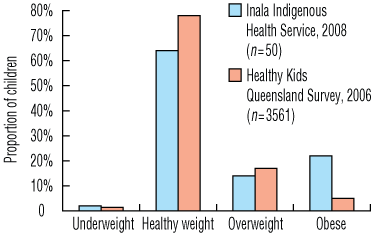 Given the paucity of studies assessing rates of overweight and obesity in Indigenous children in urban areas, we conducted a pilot study to determine whether the Aboriginal and Torres Strait Islander child health check (Medicare item 708) is a useful tool for opportunistically assessing dietary habits, blood pressure and rates of overweight and obesity in children attending the Inala Indigenous Health Service. Data were collected from April 2008 to September 2008, and were compared with the 2006 Healthy Kids Queensland (HKQ) Survey.4