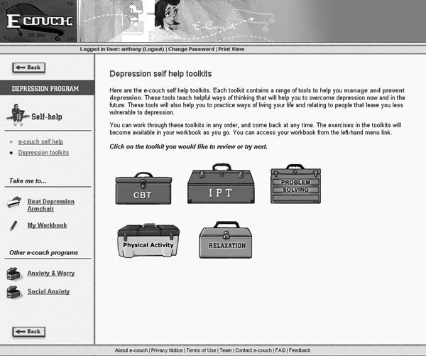 e-couch (http://www.ecouch.anu.edu.au) provides evidence-based information and automated self-help skills training for depression, generalised anxiety disorder and social anxiety disorder. It includes an information module for each disorder, 12 interactive self-help toolkits and 42 workbook exercises. The toolkits, such as those for depression (Box 1), are based on treatments for which there is scientific evidence of efficacy for the target condition. Further streams, including self-help for panic disorder, relationship and divorce problems, and grief and loss, are scheduled for release in the near future, and e-couch is currently being evaluated in an RCT.
