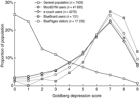 All e-hub programs include the Goldberg Depression and Anxiety Scales,12,13 each comprising nine items coded 0 (no) or 1 (yes) and summed to yield a total score ranging from 0 to 9. Higher scores reflect a greater number of depressive or anxiety symptoms. Users of the e-couch and MoodGYM programs are required to complete the Goldberg scales to progress through their program. Registered BlueBoard users can complete the scales if they wish, and BluePages offers the scales for self-assessment without registration. The mean scores for users of the different services are shown in Box 2 and reflect a high level of depressive and anxiety symptoms. Users’ mean scores are classified in the middle to high, or high to very high ranges when compared with relevant age and sex norms.14 Box 3 shows the distribution of Goldberg depression scale scores for e-hub service users compared with scores from an Australian community sample of 7439 individuals:15 88.1% of the general population participants scored less than 6 on the scale, whereas 68.8% of the e-hub service users scored 6 or more.