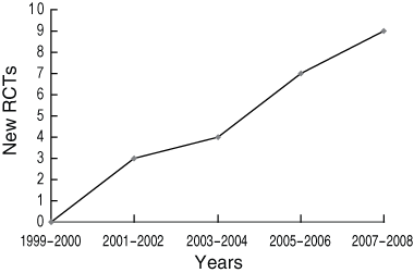 1 Growth in randomised controlled trials (RCTs) of the efficacy or effectiveness of depression and anxiety internet interventions