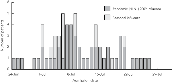 Sixty-five patients were admitted to Liverpool Hospital with a laboratory-confirmed diagnosis of influenza between 17 June and 31 July 2009. One of these patients had been admitted for ischaemic gut, and was excluded from the analysis because the patient did not have a concurrent influenza-like illness. Of the remaining 64 patients, 48 tested positive for pandemic (H1N1) 2009 influenza and the remaining 16 tested positive for seasonal influenza A (11 for subtype H3 and five for untypeable non-pandemic [H1N1] 2009 influenza). The epidemic curve showed that the peak of the outbreak occurred around 8 July (Box 1). Five of the 64 cases of influenza (all pandemic [H1N1] 2009) were health-care associated.