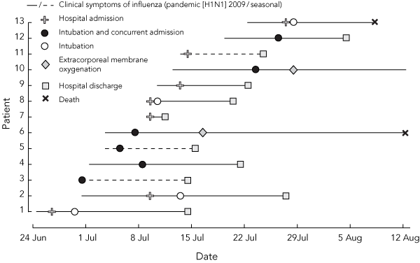 Thirteen patients were admitted to the intensive care unit (ICU) — three with seasonal and 10 with pandemic (H1N1) 2009 influenza. The clinical course and hospitalisation of these patients is illustrated in Box 3. Of the three patients remaining in ICU, two died (patient 13 and patient 6 in Box 3 on 8 August and 12 August, respectively), with the remaining patient discharged alive from hospital on 23 September 2009.