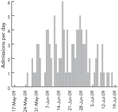 Box 2 shows the daily admissions of patients with confirmed pandemic (H1N1) 2009 influenza infection at the participating hospitals. An apparent peak of 4–6 admissions per day was noted between 12 and 28 June (peak, 16 June), with a decline in admissions thereafter.