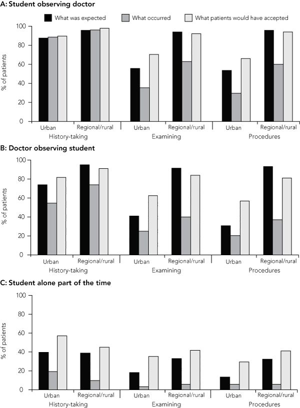 This study replicates an important finding of the previous survey in an urban setting,14 that patients were willing to accept more student involvement than actually occurred. However, there were substantial differences in the student clinical activities that the two patient groups expected, experienced or accepted. Despite the fact that the regional/rural students had relatively less clinical experience than their urban counterparts at the time of study, the regional/rural patients expected, and would have accepted, higher levels of involvement than occurred. Also, in the regional/rural setting, students were more involved in patient consultation than the urban students.