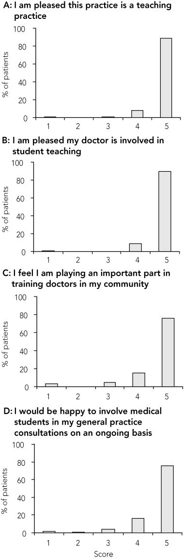 Patients strongly supported the involvement of their general practice in medical student teaching, with 89% strongly agreeing that they were pleased the practice was a teaching practice and 90% that their doctor was involved in teaching (Box 3).
