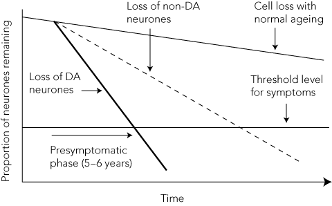 Recent advances in molecular biology have increased our understanding of pathogenesis. The discovery, in 1997, of an alpha-synuclein gene mutation in familial PD3 provided a “proof of principle” of a genetic contribution to PD, as it turned out that the encoded protein was a major component of the Lewy body, a pathological hallmark of PD.4 Although abnormal cellular protein aggregation and misfolding are common precursors to neuronal death, the function of the six identified familial PD genes indicates that this process may result from a wide range of cellular disorders.5 The cause of the much commoner sporadic or idiopathic PD is even less clear, but there is evidence that some monogenic variants or polymorphisms may represent susceptibility genes, conferring increased risk of PD. Many environmental risk factors for PD have been proposed, but epidemiological evidence suggests that the effects are relatively small.6