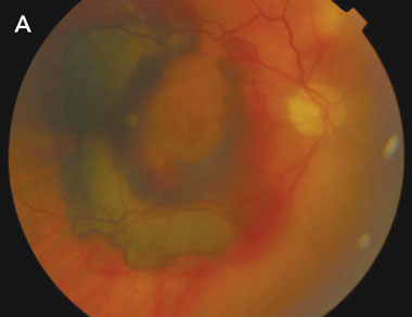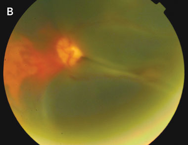 A: Fundus photograph of the right eye at presentation, showing macular subretinal and intraretinal haemorrhage. The mild haziness of the photograph is indicative of vitreous haemorrhage. |