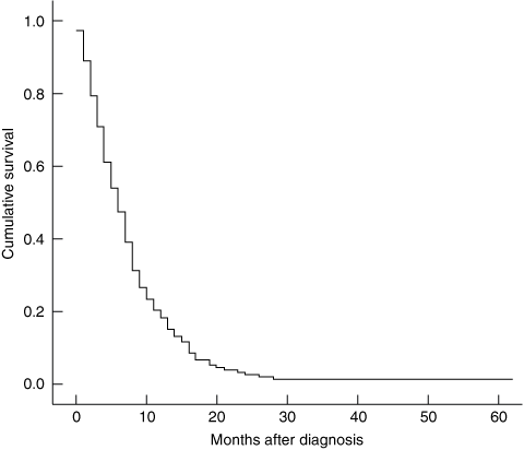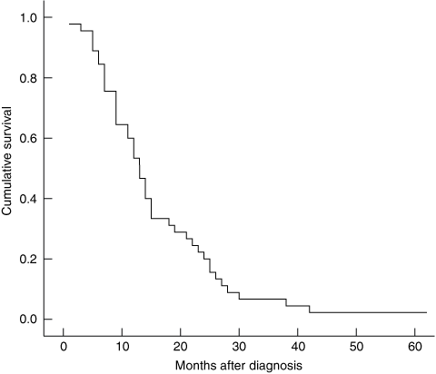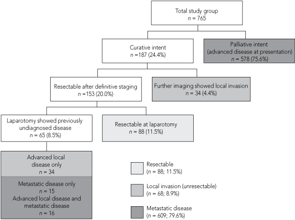 Most patients with pancreatic cancer have metastatic disease at presentation; these patients may gain symptomatic benefit and a small survival advantage from systemic chemotherapy.16 Treatment is generally well tolerated. The pivotal trial of gemcitabine chemotherapy for patients with advanced, unresectable pancreatic cancer showed that 23.8% of patients gained clinical benefit defined as a sustained (> 4 week) improvement in at least one of pain, performance status and weight, without worsening of the others.16 Median overall survival was 5.7 months. Similarly, we showed that gemcitabine chemotherapy, used as a palliative treatment, was well tolerated and associated with a median overall survival of 6.6 months.