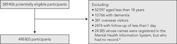 For users of MHS (Groups A and B), the start of follow-up (T0) was 1 January 1990 for people recorded in the MHIS before 1 January 1990, or the first date of registration with the MHIS for those who were first recorded from 1 January 1990 onwards. For non-users (Group C), T0 was the same as that of their matched person in Group A. People aged less than 18 years, those diagnosed with dementia, overseas visitors, those with a follow-up period of less than 1 day and people recorded in the MHIS with only incomplete mental health outpatient records were excluded from the study (Box 2).