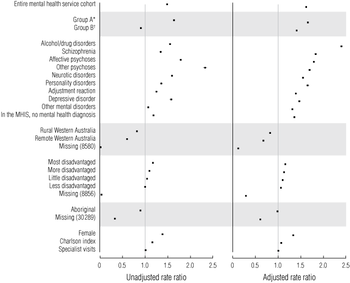 There were 498 803 eligible participants selected: 204 727 users of MHS and 294 076 non-users (Box 1). Characteristics of the study cohorts at T0 are shown in Box 4. Relative to non-users, users of MHS were more socially disadvantaged, more likely to be Indigenous and more likely to live in remote WA. Among users of MHS, Group B was younger, had a higher ratio of males to females (Box 4), and higher proportions of alcohol/drug disorders, schizophrenia and personality disorders compared with Group A (Box 5).