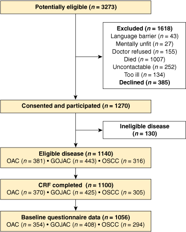 We identified 3273 potentially eligible patients with oesophageal cancer, of whom 1618 were excluded for various reasons and 385 declined to participate (Box 1). Of the remaining 1270, 1140 patients had histologically confirmed oesophageal cancer and gave consent for access to their medical records. Completed case report forms were available for 1100 patients (370 OAC, 425 GOJAC and 305 OSCC) and linked questionnaire data were available for 1056 patients.