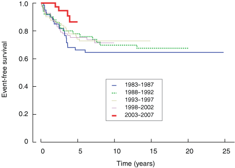 Four-year EFS for the entire PMH cohort increased from 66% (SE, 6%) for 1983–1987 to 88% (SE, 6%) for 2002–2005, while overall survival over the same period improved from 78% (SE, 5%) to 94% (SE, 4%). EFS by period is illustrated in Box 2.