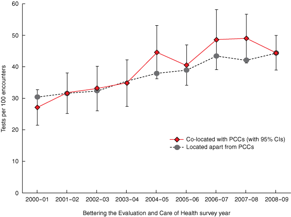 All of the other variables shown in Box 2 were either significantly associated (P < 0.05), or had one or more categories that were significantly associated, with both test-ordering rates and the likelihood of ordering one or more tests in encounters. Hence, all were included as covariates in the adjusted analyses. In addition, test-ordering rates increased sharply over the study period in both co-located practices and practices located apart from PCCs (Box 4), so dummy variables for each BEACH survey year were included in the adjusted analyses.