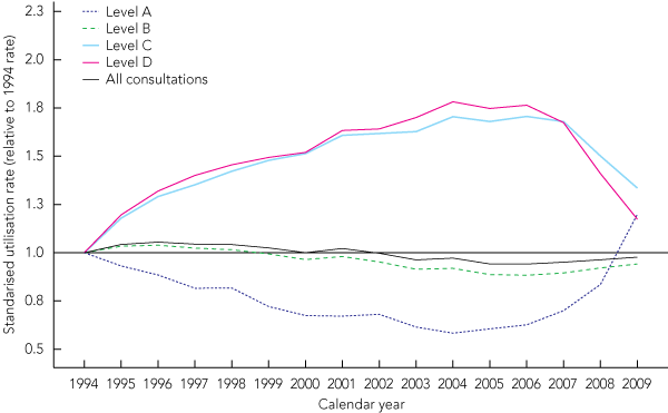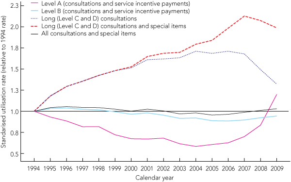 Results: Utilisation rates of Level C and D (long) consultations increased consistently from 1994 to 2004, but by 2009 a considerable decline had occurred. A reverse of this pattern was observed for Level A (short) consultations. When utilisation rates for special items and long consultations were combined, the combined utilisation rate followed an upward trend until 2007, but also declined in 2008 and 2009.