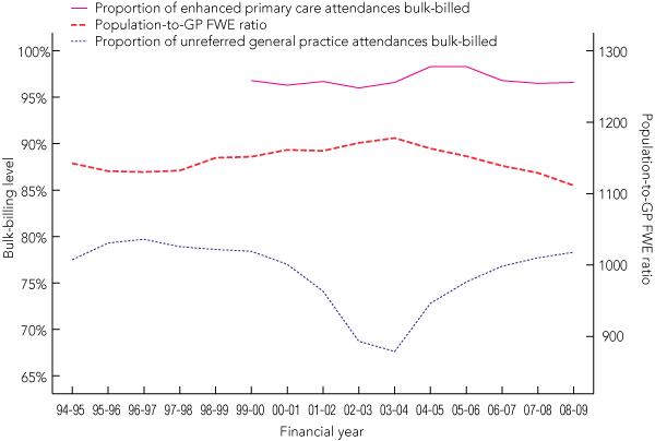 Box 4 shows the population-to-GP FWE ratio and bulk-billing levels for unreferred and enhanced primary care attendances over time. Only slight variation was observed in the population-to-GP FWE ratio (mean [SD], 1147 [18]), and the level of bulk-billing for enhanced primary care attendances was steady (mean [SD], 96.9% [0.8%]). The proportion of unreferred GP attendances that were bulk-billed decreased markedly between the financial years 2002–03 and 2003–04, returning to the previously observed level in 2008–09. Bulk-billing was lowest (67.6%) in 2003–04, coinciding with a (modest) peak of undersupply of GPs. As such, the changes in consultation patterns we have identified occurred during a period of relatively stable GP workforce supply, but while bulk-billing was recovering to its previous level.