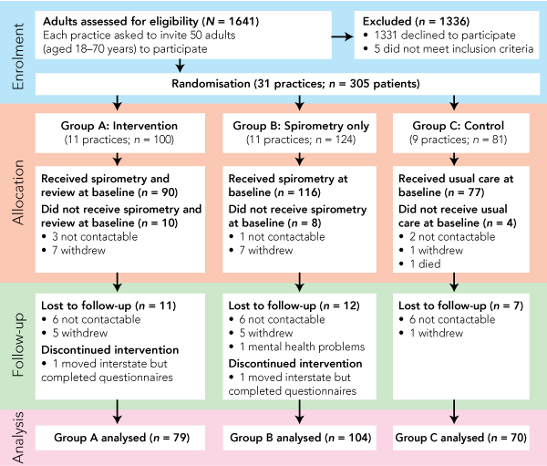 Victoria has the lowest rate of Medicare claims of any Australian state for spirometry and complex lung function tests, particularly office-based tests,8 despite having a similar prevalence of asthma9 and COPD10 to other states. This presents a unique opportunity to investigate the role of spirometry in improving the management of chronic respiratory diseases. We therefore conducted a randomised controlled trial (RCT) of spirometry with regular medical review as an intervention for managing asthma and COPD in a general practice setting. Our aim was to determine whether this intervention resulted in improvements in quality of life, increased written asthma action plans, or reductions in respiratory symptoms, days lost from usual activities, emergency presentations or hospital admissions, compared with usual care.