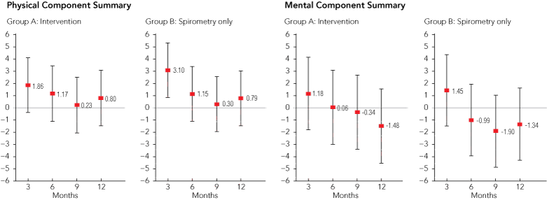 Hierarchical linear regression models with levels for practice, individuals within practices, and repeated measurements per individual were used to estimate effects of the intervention on SF-36 scores across post-baseline time points. These models included an interaction between randomisation group and time point (3, 6, 9 and 12 months), and adjusted for baseline SF-36 scores, age, sex, diagnosis, smoking history and socioeconomic status. The intervention effects were interpreted as differences between groups in their adjusted mean changes from baseline.18