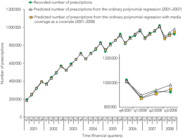 For Model 1, we used the data for 2001–2007 and then used this model to predict the number of scripts in the first three quarters of 2008. The average difference between the predicted numbers based on the prior 7 years and the recorded numbers for the first three quarters of 2008 was considered as the effect size of the media coverage.