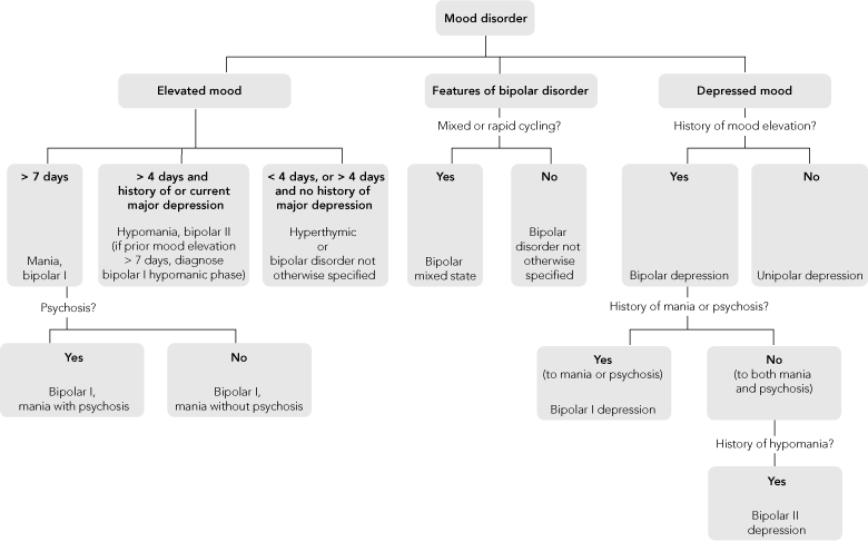 Briefer (4 days or more), mild episodes of mood elevation define bipolar II disorder; lengthier (7 days or more), more severe episodes (or those requiring hospitalisation), with or without psychotic features, define bipolar I disorder.