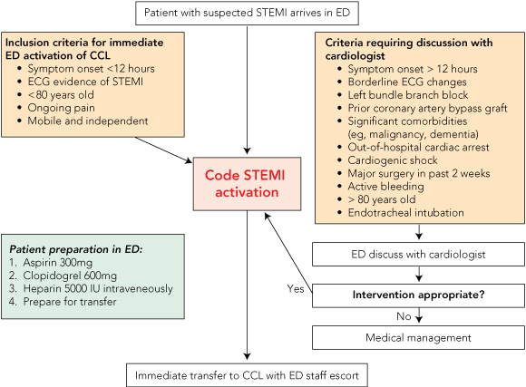 * Protocol involving emergency physician activation of the cardiac catheterisation laboratory (CCL) and immediate transfer of patients with suspected STEMI to the CCL. |