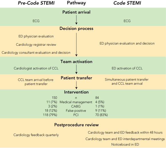 Code STEMI was introduced in February 2009 and involved four main changes: emergency physician CCL activation; ED single-call CCL activation; immediate patient transfer to the CCL by ED staff; and early feedback of results to all staff involved.