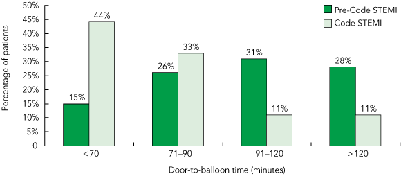 5 Percentage of patients with suspected ST-elevation myocardial infarction (STEMI) achieving various door-to-balloon times before implementation of Code STEMI* (January 2007 to January 2009) and after implementation of Code STEMI (February 2009 to October 2009)