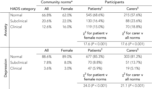 The proportions of patients and caregivers categorised as having normal, subclinical or clinical levels of anxiety and depression were all significantly different to community norms. Box 2 shows that, while clinical levels of anxiety in patients were comparable to female norms (patients, 15.0% v norms, 16.0%), patients reported less subclinical anxiety than female norms (patients, 16.4% v norms, 22.0%; χ2[3] = 17.6; P < 0.001). Conversely, while comparable on subclinical depression (patients, 8.8% v norms, 8.0%), the rate of clinical depression in patients was double that for community norms (patients, 5.9% v norms, 3.0%; χ2[3] = 24.0; P < 0.001).