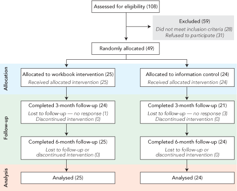 This study had three methodological strengths. First, it adhered rigorously to the 2010 CONSORT statement for the reporting of randomised trials.14 Second, it included a 6-month follow-up assessment, to further delineate the impact of the workbook. If only 3-month data had been gathered, the workbook would have appeared more efficacious than it really was. Third, the control group was exposed to information alone, rather than receiving no intervention. Given the evidence that suggests that receiving information alone is not enough to effect change,12 providing information to the control group is considered a better test of the strength of the intervention condition than just treatment as usual. However, one limitation of our study — small sample size — means that our results must be interpreted cautiously and that further studies are required before firm conclusions can be drawn.