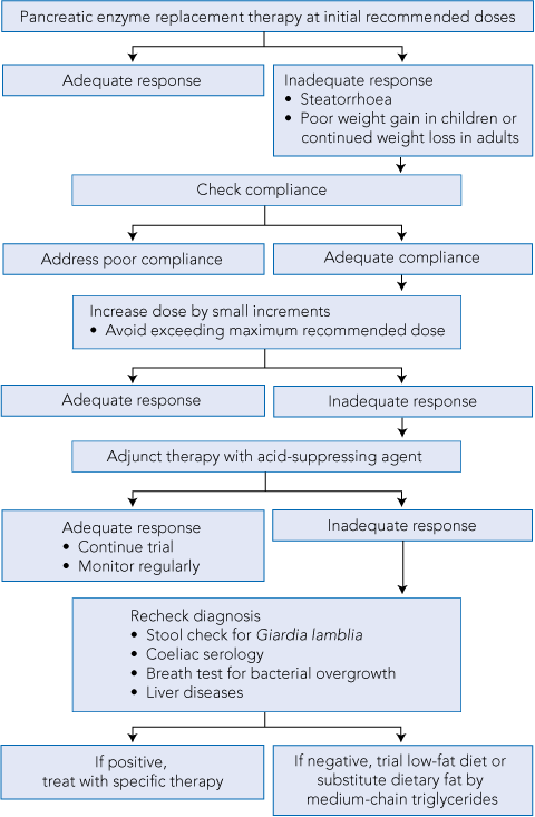 The primary treatment goal for PEI is to eliminate maldigestion and malabsorption and maintain adequate nutrition. A treatment algorithm is proposed in Box 3.