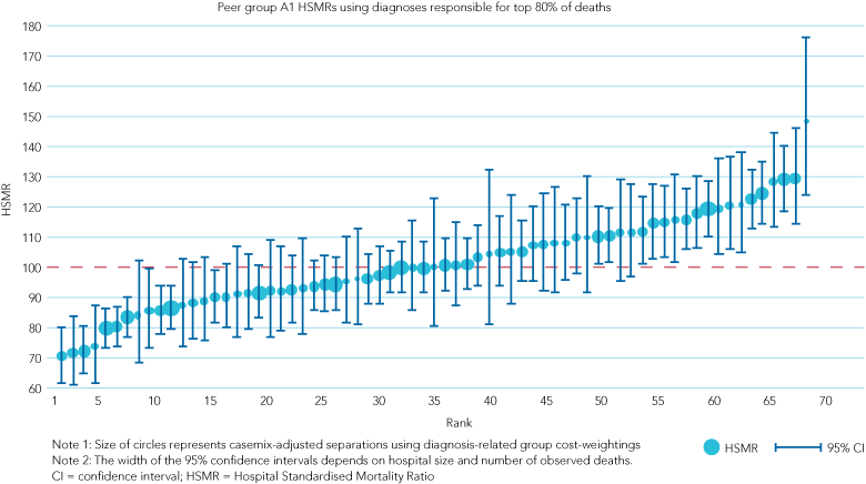 The Box shows the distribution of HSMRs across Australia for patients in one peer group of hospitals, reported using a visual presentation system known as a caterpillar plot.22 Other formats, such as funnel plots, locate hospitals against predetermined statistical parameters, and allow for identification of hospitals whose results are statistical outliers in terms of higher and lower than expected mortality.1,23 There is a concern that caterpillar plots can be turned “on their side” and used to rank hospitals. No visual plot is immune from being used as a ranking resource. If hospitals are named, and their position relative to each other indicated, they can be ranked. A sustained education campaign will be necessary to minimise the inappropriate use of HSMR information, if that information is to be placed in the public domain.