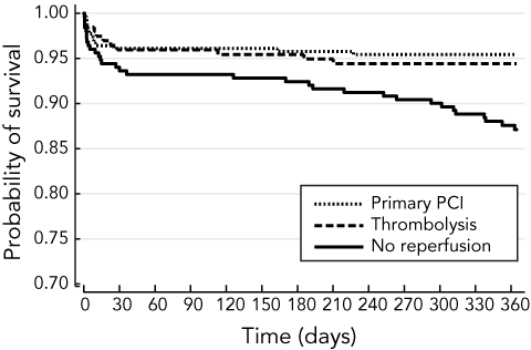 After adjusting for baseline risk using the GRACE score and adjusting for potential confounders, reperfusion of any kind was associated with a reduction in mortality throughout 12 months of follow-up (hazard ratio [HR], 0.44; 95% CI, 0.25–0.78; P < 0.01). This benefit remained evident for primary PCI compared individually with those receiving no reperfusion therapy (HR, 0.33; 95% CI, 0.18–0.61; P < 0.001), but not for thrombolysis (HR, 0.66; 95% CI, 0.26–1.68; P = 0.38; Box 5).