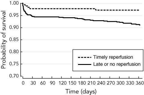 Timely reperfusion, compared with late or no reperfusion, was associated with a decrease in the odds of death throughout the 12-month follow-up period of 78.3% (HR, 0.22; 95% CI, 0.05–0.95; P = 0.04), even after adjustment by baseline GRACE score (Box 6). The difference in the combined rate of death, recurrent MI, and stroke throughout the 12 months did not reach statistical significance (HR, 0.66; 95% CI, 0.36–1.20, P = 0.17).