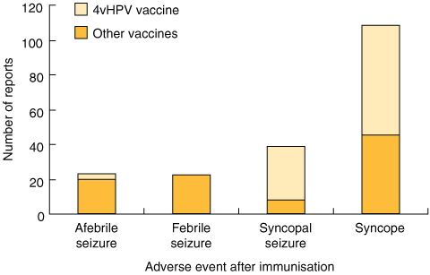 Monitoring of adverse events following immunisation (AEFI) is important. AEFI temporally associated with vaccines are not necessarily causally related, but require further investigation. Clinical trials safety data demonstrated no difference in syncope between 4vHPV and control recipients (0.1% vaccine; 0.2% placebo) in more than 21 000 participants.5 4vHPV post-licensure safety monitoring, critical for less common AEFI, has been described internationally and in Australia.6-8