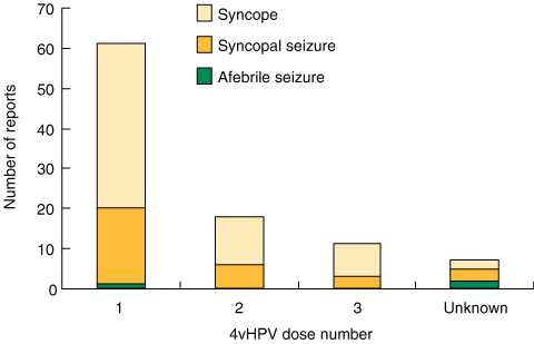 The reporting rate of syncopal seizures after 4vHPV vaccine found in our study was 2.6 per 100 000 doses distributed. This compares with 1.2 per 100 000 doses in the 1998 Australian measles catch-up vaccination campaign.18 That campaign, however, included young children less likely to experience syncopal episodes. The 4vHPV vaccine post-licensure reporting of syncopal seizures has led the product information to include: “syncope, sometimes accompanied by tonic–clonic movements”.19