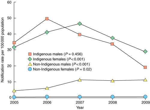 A total of 5525 cases of infectious syphilis were reported nationally between 2005 and 2009, including 189 cases for which Indigenous status was not reported. Based on 123 notifications in 2009 in the Indigenous population, the overall crude notification rate per 100 000 population was 31 in 2005, 40 in 2006, decreasing to 25 in 2009, with a significant downward trend observed over the 5-year period (P < 0.001).