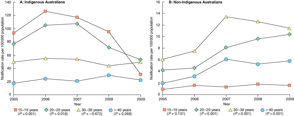 By 2009, notification rates in Indigenous people aged 15–19 years were at a level below all other age groups, excluding the ≥ 40 years group. This may be a consequence of people aged over 40 years missing out on the benefit of annual screening rounds, which generally target people aged 15–35 years.17