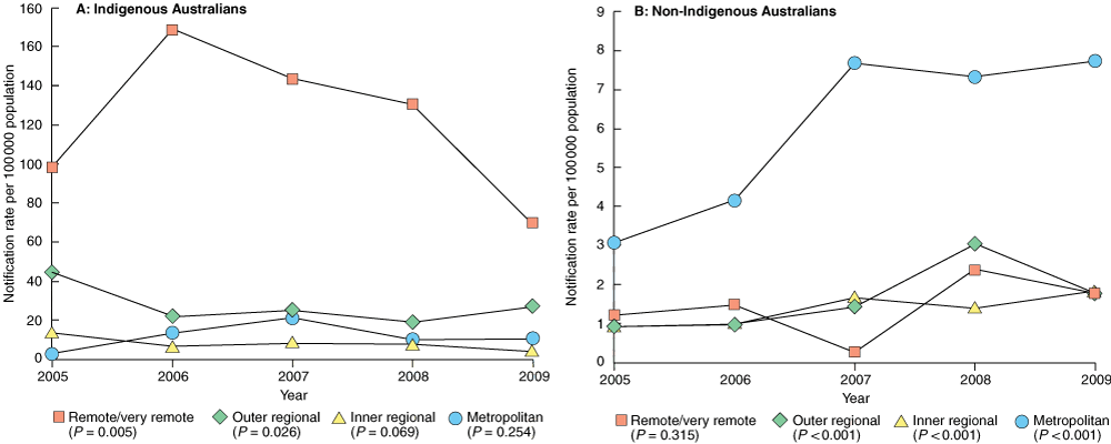 Results: From 2005 to 2009, in the Indigenous population, there was a substantial decline in the notification rate for infectious syphilis nationally; as well as in the following subgroups: females, 15–29 year olds, and people living in outer regional and remote areas in the Northern Territory and Queensland. In contrast, there was a significant (P < 0.001) upward trend in the notification rate in the non-Indigenous population nationally; as well as in males, in people aged 20 years and over, and in residents of metropolitan and regional areas, New South Wales, Queensland, South Australia, Victoria and Western Australia. The highest summary rate ratios were seen in remote/very remote areas (86.33; 95% CI, 57.45–129.74), in 15–19 year olds (64.65; 95% CI, 51.12–81.78), in females (24.59; 95% CI, 19.73–30.65), and in Western Australia (23.89; 95% CI, 19.82–28.82).