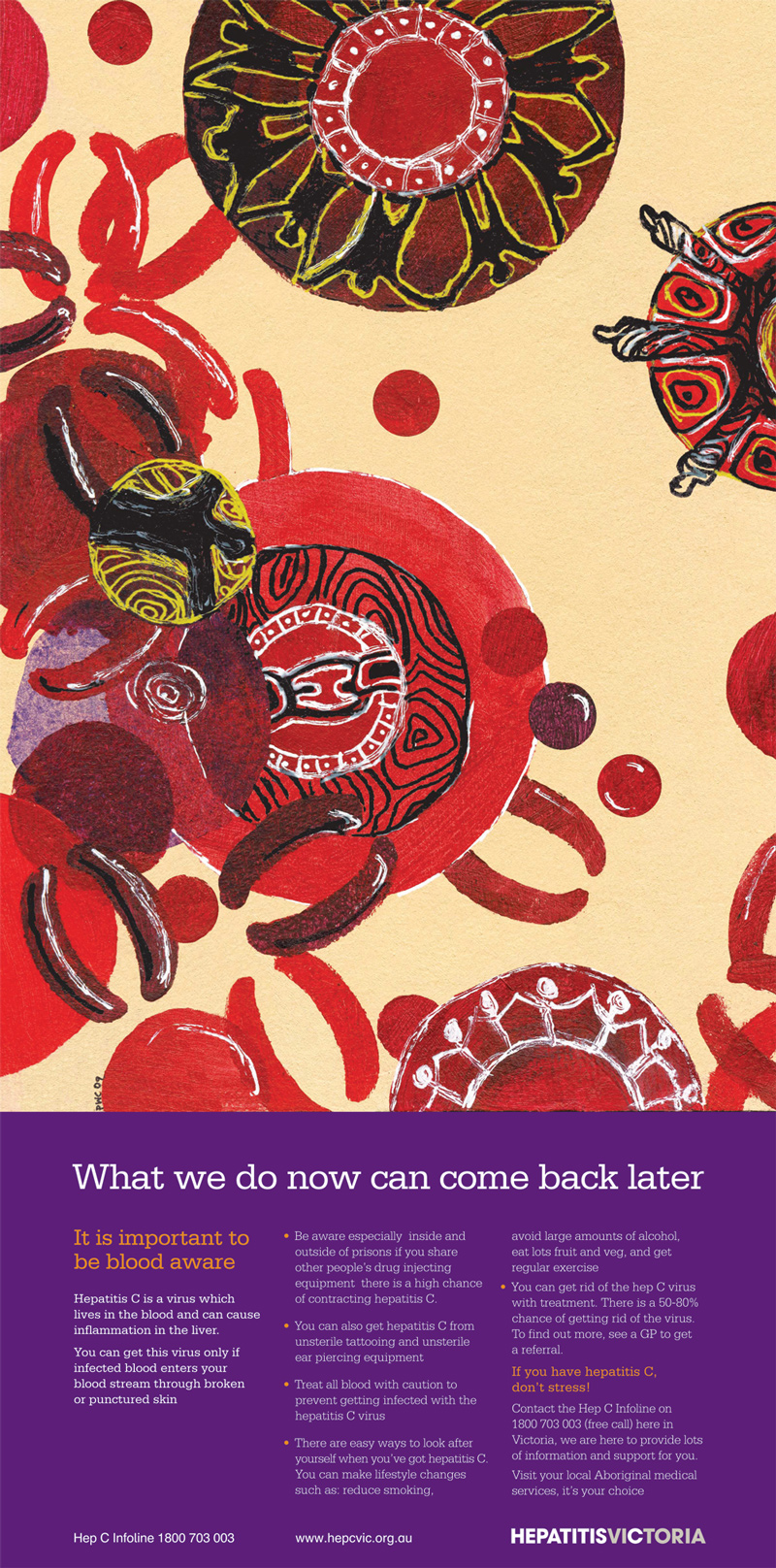 Hepatitis C is a blood-borne virus, and so in this poster the Aboriginal communities in Victoria are represented as blood cells, holding hands to indicate community strength, and coming together to talk about hepatitis and injecting drug use. Hepatitis C is very much an issue for urban Aboriginal communities in Australia. By coming together we encourage conversations about the more marginalised people in the community who are affected by the virus, and, ultimately, help to prevent and treat this disease.