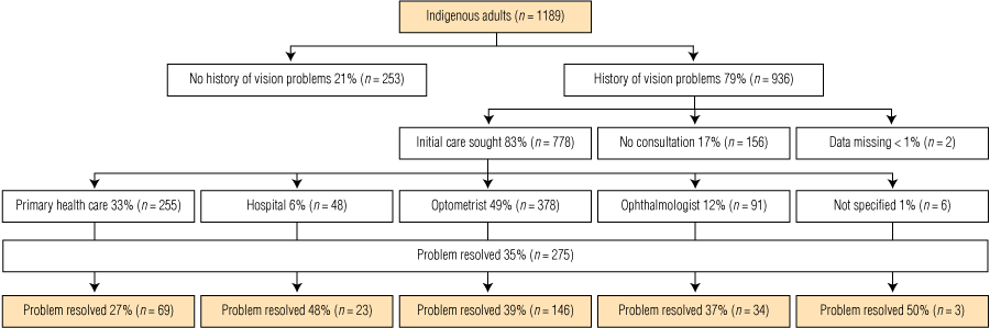 Seventy-nine per cent (936/1189) of Indigenous adults reported vision problems, of whom 83% (778/936) had sought care from an eye care service (Box 1). Similar to previous studies,5 we found use of eye care services increased with increasing age, but being male and having no education were barriers to accessing services. There was a significant association between higher education levels and higher rates of using of eye care services, with the odds for using eye care services being the highest among those with the highest level of education (data not shown). These factors should be considered when designing public health messages on the importance of using eye care services.