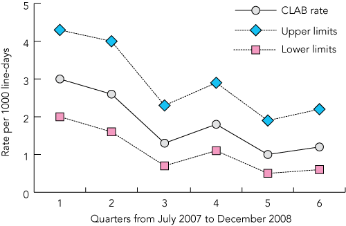 There are several practical issues that may bias our results. Surveillance projects cannot be conducted with the rigour of a trial, and there were problems with identification of CLAB. This was despite dissemination of posters and concise definition notes for quick reference to ensure definition consistency between the ICUs and infection-control practitioners. Many ICUs do not have microbiological support and frequently CLAB was reported without discussion with senior ICU staff. Improved understanding of surveillance definitions, versus clinical definitions, led to reclassification in some cases.