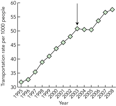 Annual standardised transportation ratios indicated a significant rise in transportations despite taking population growth and ageing into account. Compared with 1994–95, the number of transportations observed in 2007–08 was 68% greater than expected.