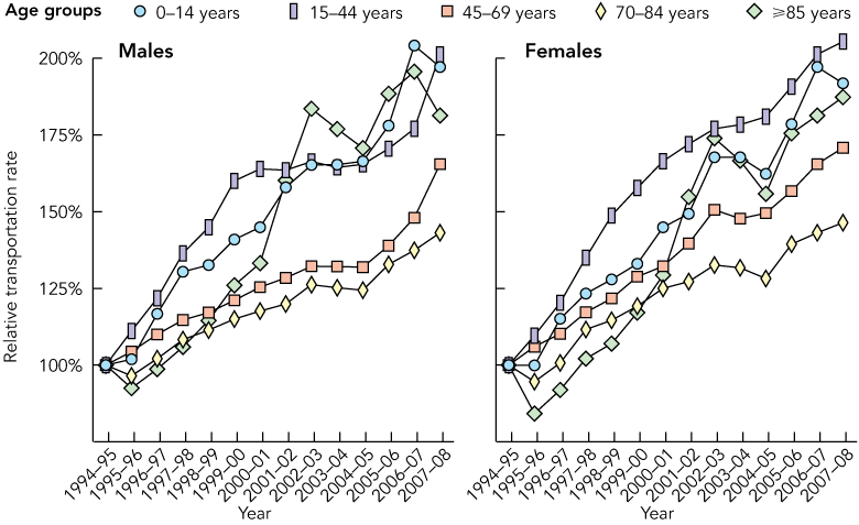 Transportation rate increases were only partly accounted for by changes in population size and age and sex distribution. The rate of transportation for all ages increased by 75% over the 14 years studied (95% CI, 62%–89%). This represented an average annual growth rate of 4.8% (95% CI, 4.3%–5.3%) beyond that explained by demographic changes. There were similar relative proportional increases in all age groups and the highest absolute rates were in the oldest patients (Box 2). Transportation rates relative to those in 1994–95 increased for males and females in all age groups in a linear and uniform manner (Box 3), suggesting an exponential increase in the transportation rates over time.