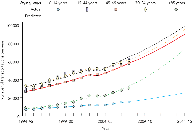 The projected numbers and rates of transportations by age group to 2014–15 (Box 4 and Box 5) demonstrate that demand by people aged ≥ 85 years will continue to accelerate in the future. Among those aged ≥ 85 years, the rate could rise from the observed 474 per 1000 people in 2007–08 to more than 800 per 1000 people in 2014–15, with the absolute numbers of transportations rising more than twofold.