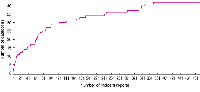 The process of category saturation and the rate at which the unique incident types were identified in the dataset are shown in Box 2. The shape of the curve indicates a rapid initial classification of different incident types, with half the total number of categories identified in the first 13.5% of the incidents. All 43 incident types were classified within 76.2% of the dataset.
