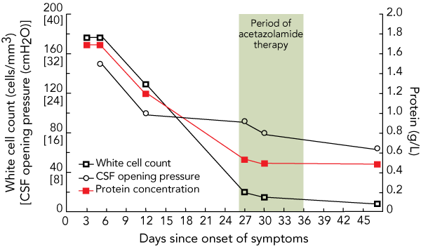 On presentation, the results of blood investigations including a full blood count, liver function tests, a C-reactive protein test, renal function tests and electrolyte level measurements were normal. A transient leukocytosis developed after admission and peaked on Day 6 of admission at 14.0 × 109/L, with a predominant neutrophilia. At no time was there significant derangement of liver function tests. Findings on brain imaging, including gadolinium enhanced magnetic resonance imaging of the brain on two occasions, magnetic resonance venogram and magnetic resonance angiogram were all normal. Serial lumbar punctures were performed (Box 1) showing the reducing white cell count and protein level. Cerebrospinal fluid (CSF) opening pressure was elevated to 30 cmH2O (RR, < 18 cmH2O) measured on Day 5 and this normalised by Day 27. Results of serological tests for human immunodeficiency virus, leptospirosis, Q fever, mycoplasma, brucellosis, psittacosis, and Ross River fever, which were performed during both the acute and convalescent phases of the illness, were negative. Repeated tests of the CSF for cryptococcal antigens were negative. CSF cultures for bacteria, fungi and mycobacteria were also negative, as was polymerase chain reaction testing for herpes viruses and enterovirus. Indirect immunofluorescence detecting total antibody against rickettsiae in the typhus group (Rickettsiae typhi and R. prowazekii), spotted fever group (R. honei and R. australis) and scrub typhus (Orientia tsutsugamushi) was performed in parallel on serum collected on Days 9 and 41. Antibodies against R. typhi were detected at a titre of 1/256 on Day 9, rising to ≥ 1/1024 on Day 41. Antibodies in each CSF specimen showed cross-reactivity with R. prowazekii at equivalent titres, but not with other rickettsial species.