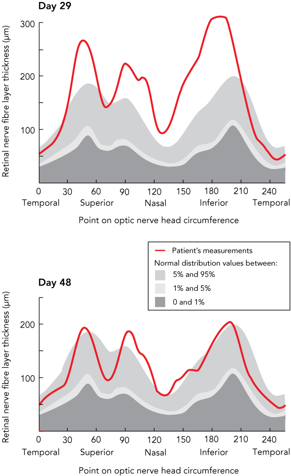 The patient first noticed diplopia and reduced visual acuity on Day 10, which peaked on Day 20 of his illness. At this point, bilateral partial 6th nerve palsies and papilloedema were noted. Because of persistent visual symptoms and papilloedema, therapy with 250 mg acetazolamide orally, twice daily was commenced on Day 26. Papilloedema was documented on Day 28 by ocular coherence tomography (OCT), a measure of retinal nerve fibre layer thickness and indicative of the degree of optic disc swelling (Box 2). The 6th nerve palsies resolved after Day 30 and regular fundoscopy and repeat retinal OCT showed the papilloedema continued to resolve (Box 2). Acetazolamide therapy was ceased on Day 35. The patient had not experienced recurrence of the headaches or neurological symptoms at 6 months after the onset of the illness.