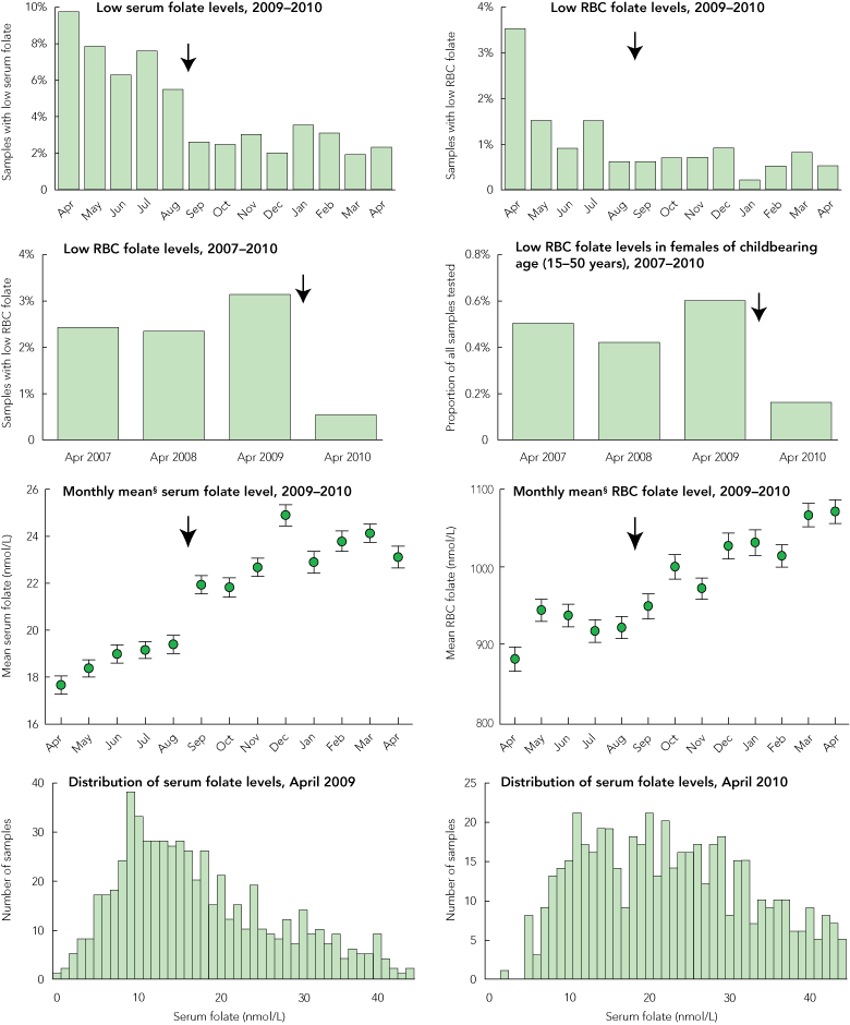 Between April 2009 and April 2010, the prevalence of low serum folate levels decreased by 77% (from 9.3% to 2.1%) and the prevalence of low RBC folate levels decreased by 85% (from 3.4% to 0.5%) (Box). Our analysis of results for each April from 2007 to 2010 showed a marked decrease in low RBC folate levels after April 2009 (Box). The prevalence of low RBC folate levels among females of childbearing age (15–50 years) also decreased after April 2009 (Box), and in April 2010, there was only one sample from a female of childbearing age out of a total of 609 samples tested (0.16%) which had a low RBC folate level.