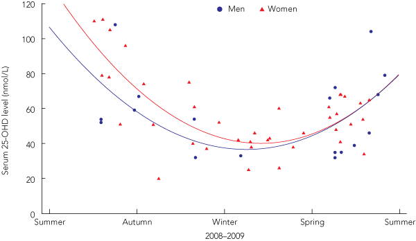Our findings suggest that vitamin D insufficiency (serum 25-OHD ≤ 60 nmol/L) is highly prevalent in this population of adult Aboriginal Australians. Mean 25-OHD levels peaked in summer (84.2 nmol/L), but were below 60 nmol/L in other seasons, indicating prolonged periods of vitamin D insufficiency. The overall mean serum 25-OHD level (56.8 nmol/L) was significantly lower than the mean of 76.9 nmol/L reported for a control group of 36 Adelaide residents (mean age, 32 years).14 Others have reported data from non-Indigenous Australians indicating that in winter and spring the proportion of the population with 25-OHD levels less than 50 nmol/L varied between 37.4% (Geelong, latitude 37 °S) and 67.3% (Hobart, 43 °S).15 In our Aboriginal Australian population, 20 of 37 participants (54%) assessed during winter and spring in Adelaide (35 °S) had a level below 50 nmol/L. These data suggest that Aboriginal Australians are likely to have a poorer vitamin D status than non-Indigenous Australians.