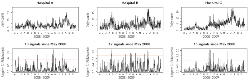 For example, the CUSUM plan for Hospital C in Box 2 first signals an unusual outbreak in December 2008, but despite the models being updated with this outbreak data, the CUSUM continues to signal that the outbreak remains unusual early in 2009 prior to the commencement of the usual winter influenza season.