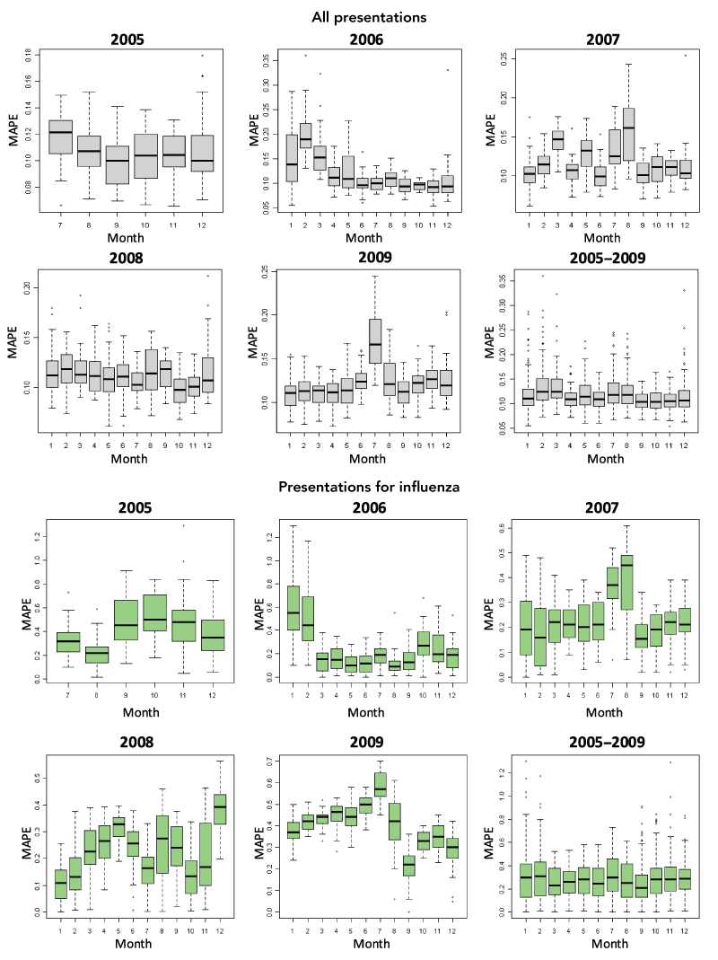 Comparing forecasts for ED presentations for influenza-like symptoms with actual presentations in 2009 shows that, at all sites, the historically based forecasts underestimated observed conditions. However, these forecasts represent a baseline for where we would normally expect things to be based on the preceding years. When validating the accuracy of the prediction algorithms across statewide data for the 2009 influenza season, it was found that forecasting accuracy was significantly worse for influenza presentations compared with all ED presentations in 2009, and that the accuracy in July 2009 was significantly worse than that for the surrounding months (Box 3).